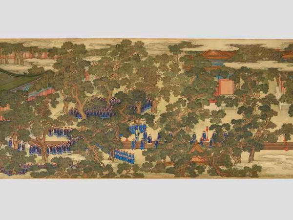 Peinture sur rouleau d’une cérémonie impériale au temple de l’Agriculture de Pékin. « Shidian tu » 观耕卷. Règne de Yongzheng (1723-1735). Encre et couleurs sur soie, métal émaillé. Photo Pauline Guyon © musée du quai Branly – Jacques Chirac, photo Pauline Guyon