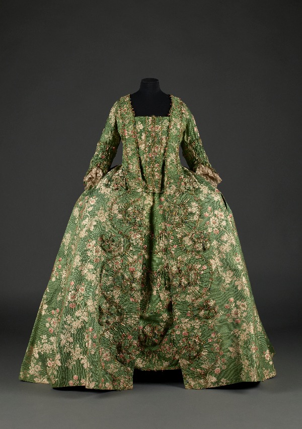 La première robe exposée, éblouissante, donne le ton avec une robe aux motifs fleuris de 1755/65, en taffetas de soie vert et blanc, fils de soie colorés, doublée de lin, et ornée de rubans. Il s’agit d’une robe typique dite « à la française », reconnaissables à ses deux grands plis dorsaux qui partent du col.