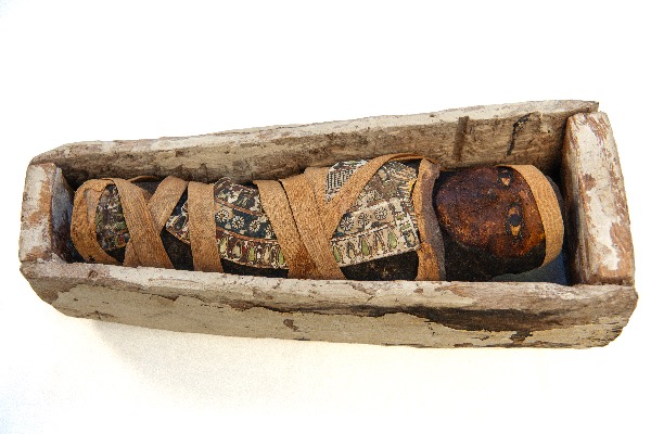Simulacre d’une momie d’enfant dans son cercueil. Aksoum, Ethiopie, 19e siècle. Cet objet a été vendu comme une véritable « momie d’enfant » pour satisfaire une demande très importante. Mais l’imagerie a révélé que cet objet ne comprenait pas de restes humains : il s’agit d’un faux, un simulacre réemployant le cartonnage ancien d’un défunt momifié. Conservé au Musée de l’Homme © MNHN – J.-C. Domenech