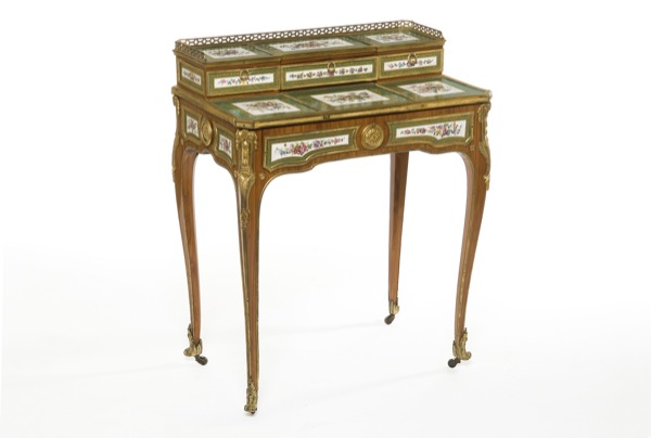 Martin Carlin (vers 1730-1785), Bonheur-du-jour, Paris, vers 1766. Chêne, bois de rose, érable ondé, ébène, amarante, bronze ciselé et doré, porcelaine tendre © Les Arts Décoratifs / Christophe Dellière