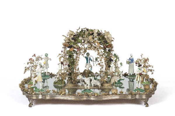 Dès l’entrée, le visiteur est projeté au XVIIIe siècle, avec des bruits de rue, de calèches, de chaises à porteur, de pas sur les pavés, au seuil de l’hôtel, avant de pénétrer – tel un invité privilégié – dans la demeure aristocratique, dont l’élégance à la française, fait jalouser toute l’Europe. Le porche incarne le statut social du propriétaire e et fait barrage au tout-venant. La cour est agrémentée de parterres de fleurs en porcelaine – l’exposition déborde de ces miniatures en céramique dans chacune des pièces -, et de vraies plantations.