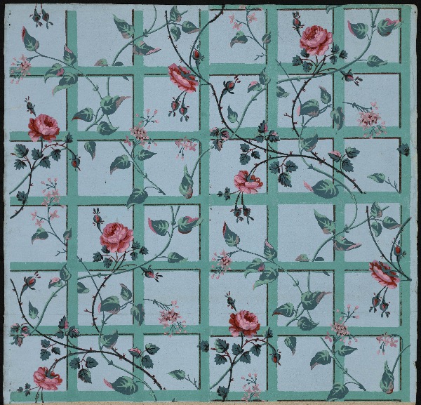 Papier peint à motif répétitif à raccord droit — Manufacture Jacquemart et Bénard, Paris, 1794-1797. Papier rabouté, fond bleu brossé à la main, impression à la planche de bois en dix couleurs © Les Arts Décoratifs / Christophe Dellière