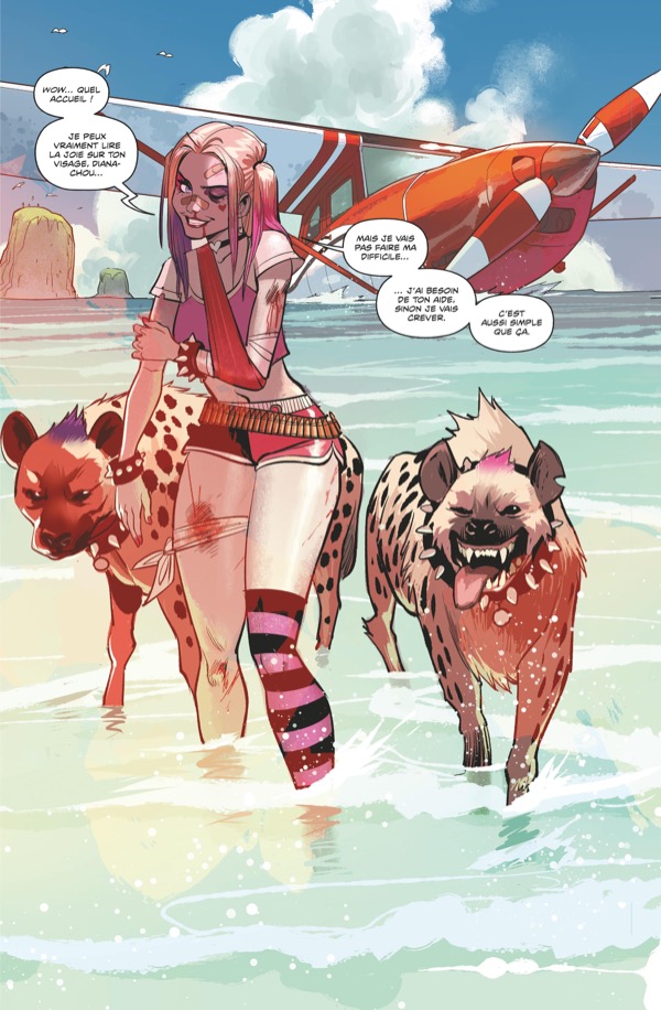 Pourtant, un avion parvient à amerrir non loin de leurs côtes. En sortent la sulfureuse Harley Quinn et ses deux hyènes chéries.